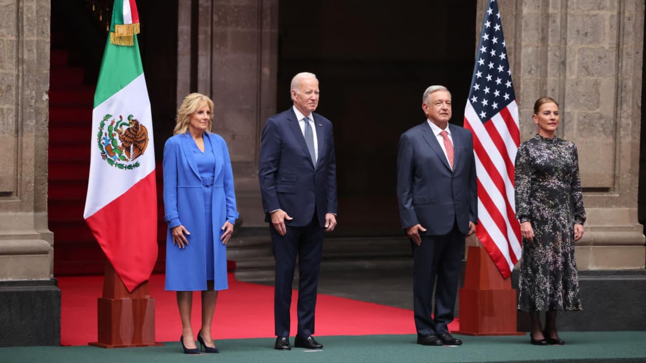 El presidente Joe Biden y la primera dama Jill Biden llegaron a México el domingo, por separado, y este lunes se desplazaron rumbo al Palacio Nacional en medio de un fuerte dispositivo de seguridad desde su hotel, ubicado en el exclusivo barrio de Polanco de la capital mexicana.