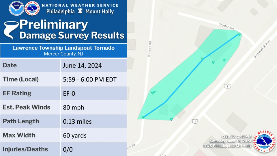 De acuerdo al Servicio Meteorológico Nacional (NWS) de Mount Holly, el tornado con tromba terrestre se produjo el viernes por la tarde. Los vientos alcanzaron las 80 millas por hora.