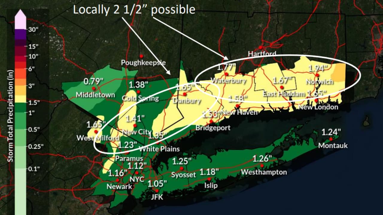 Acumulados de hasta dos pulgadas y media y fuertes vientos es el pronóstico para la noche de este viernes en Nueva York y Nueva Jersey. Advierten por inundaciones.