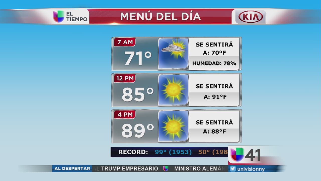 La mañana de este lunes se registra una temperatura de 71 grados con cielo parcialmente nublado, que se limpiará a lo largo del día. El termómetro marcará los 89 grados a las 4:00 p.m.