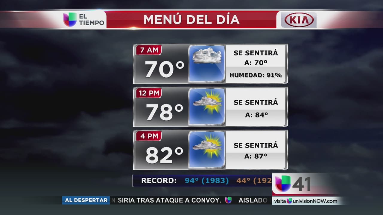 El día inicia con una temperatura de 70 grados en torno a las 7:00 a.m. que se elevará a 78 grados al mediodía y que llegará a 82 grados a las 4:00 p.m.