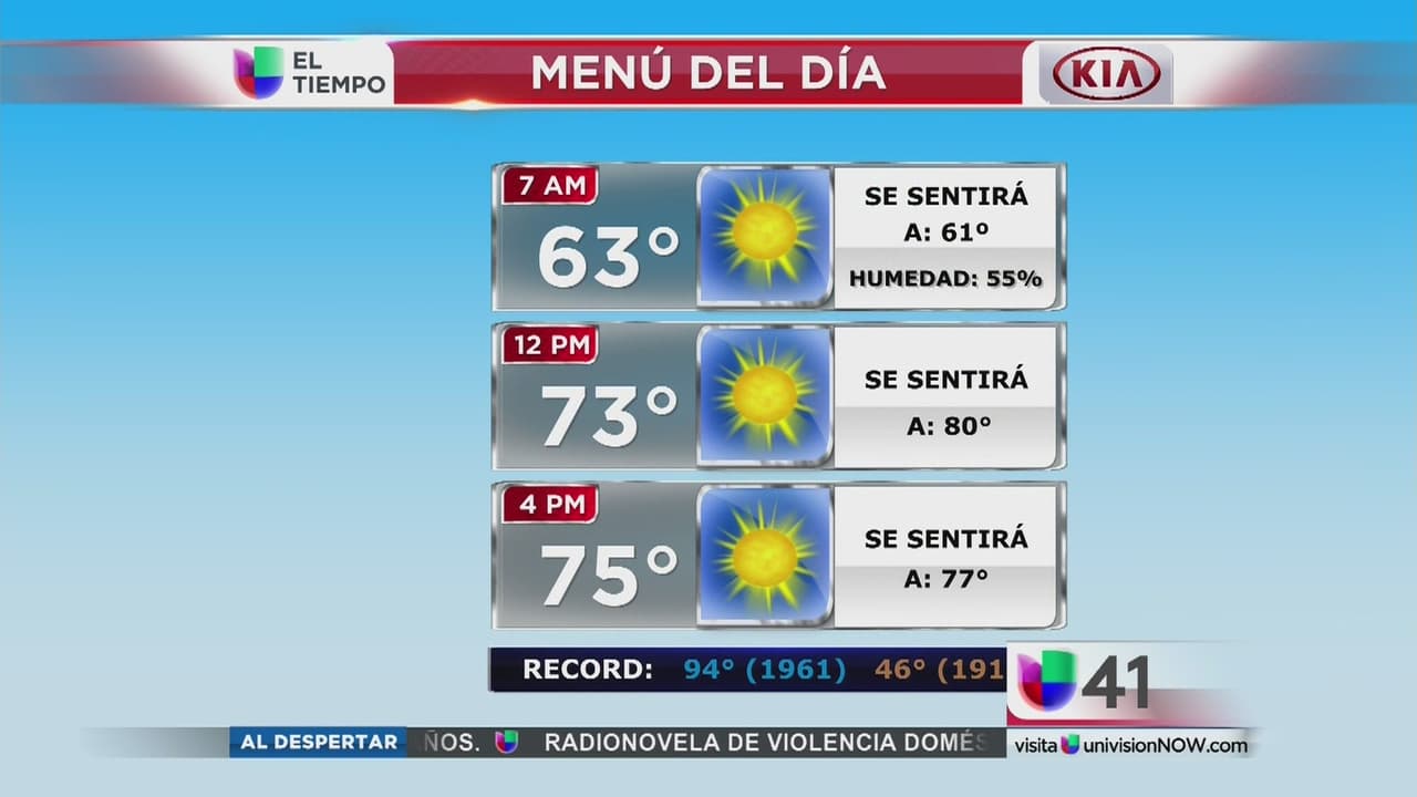 La ciudad tendrá una temperatura de 63 grados (con sensación térmica de 61) a las 7:00 a.m. que luego ascenderá a 75 grados (con sensación térmica de 77 grados) a las 4:00 p.m.