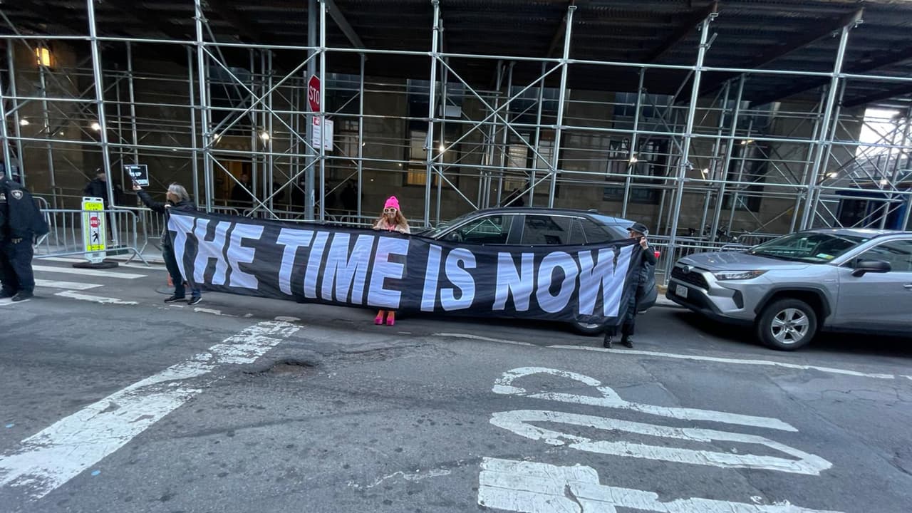 Con pancartas como "El tiempo es ahora", "Trump está acabado" y "Donald Trump es culpable", algunas personas manifestaron desde el lugar para que el proceso de investigación y acusación continúe.