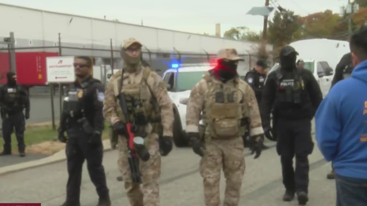 Agentes de Inmigración y Control de Aduanas (ICE) ejecutan un operativo en un almacén de Carteret, Nueva Jersey, donde se reporta la detención de al menos 10 inmigrantes, aunque testigos aseguran que el número podría ser mucho mayor.