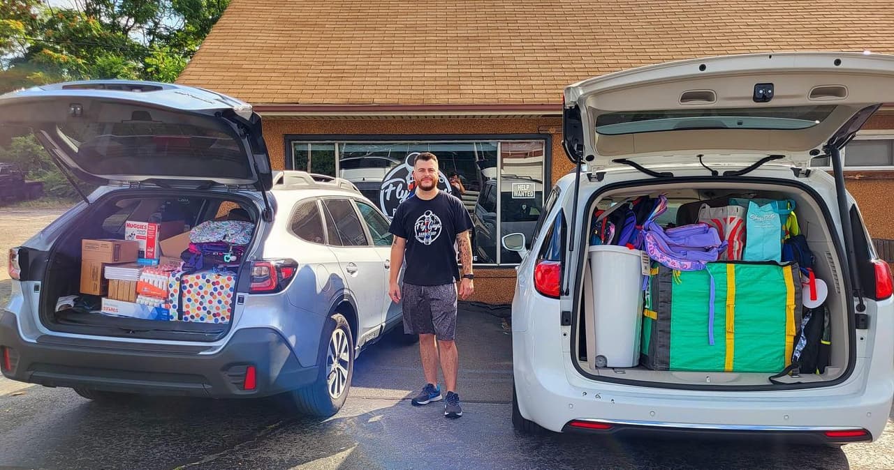 Durante todo el verano, Ryan Schoentube, dueño de la barbería Fly Guys Barbershop recolectó útiles escolares en su tienda para estudiantes necesitados.