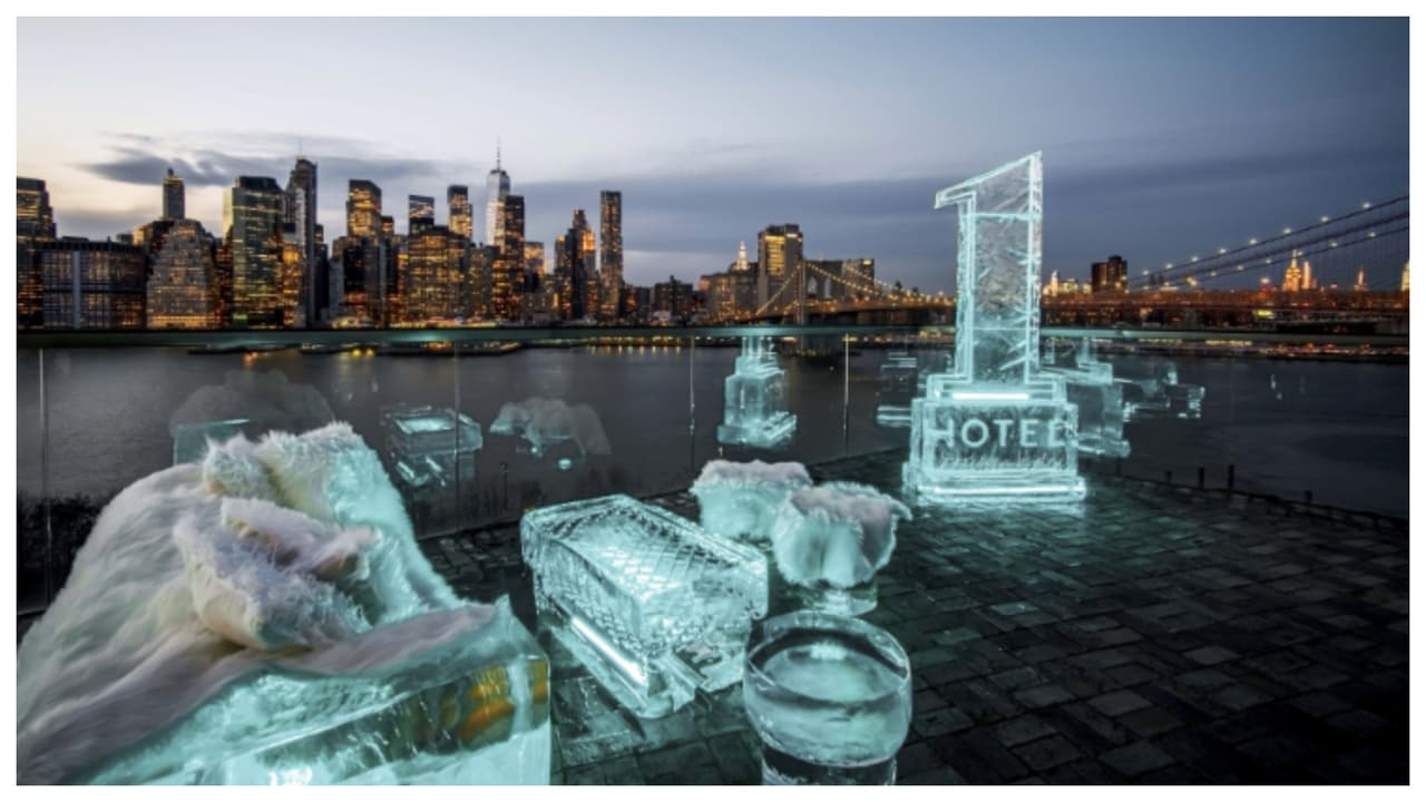 El décimo piso del 1 Hotel, justo frente al Puente Brooklyn, se convierte en un oasis polar, donde cócteles originales se toman sobre asientos de hielo.
