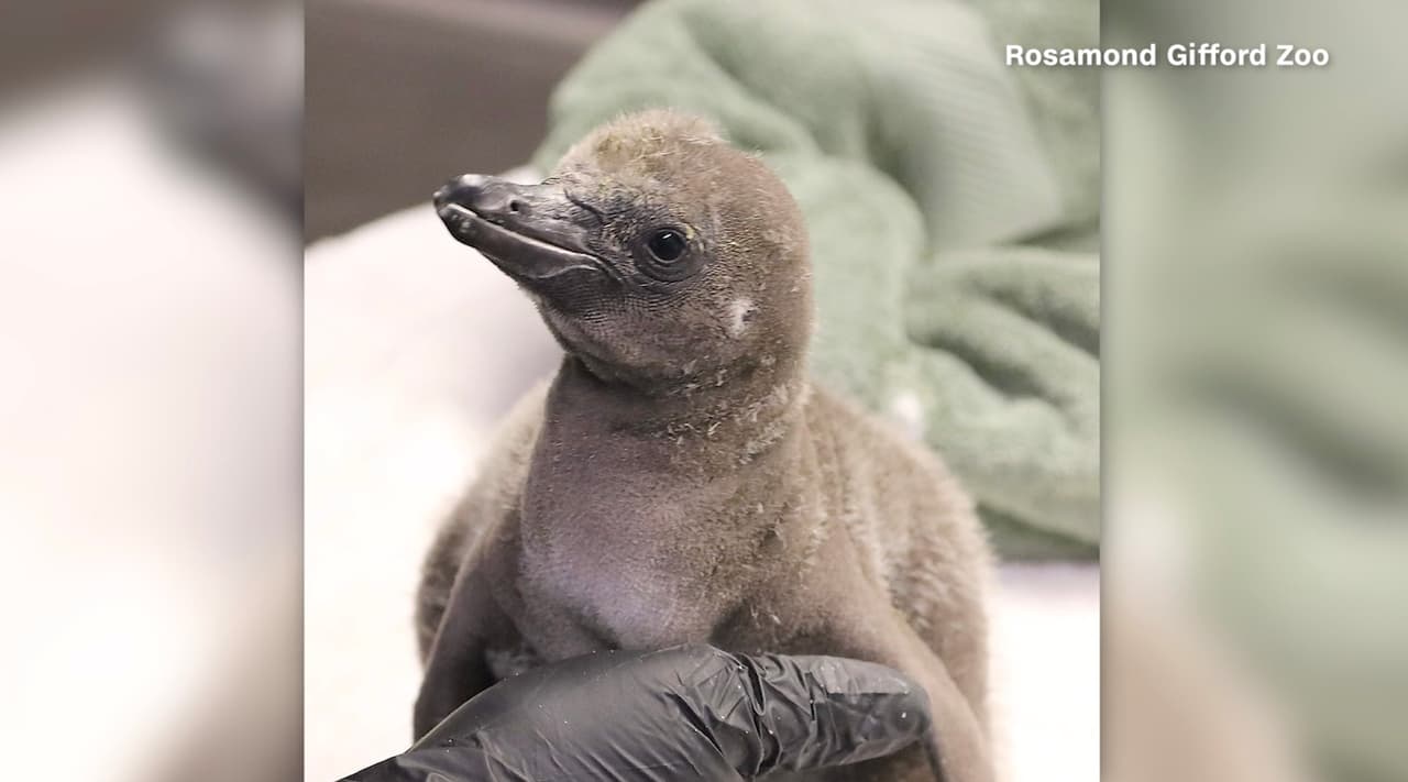 El pequeño pingüino, nacido el 1 de enero de 2022, fue empollado por esta pareja, luego de que el huevo fuera insertado en su nido