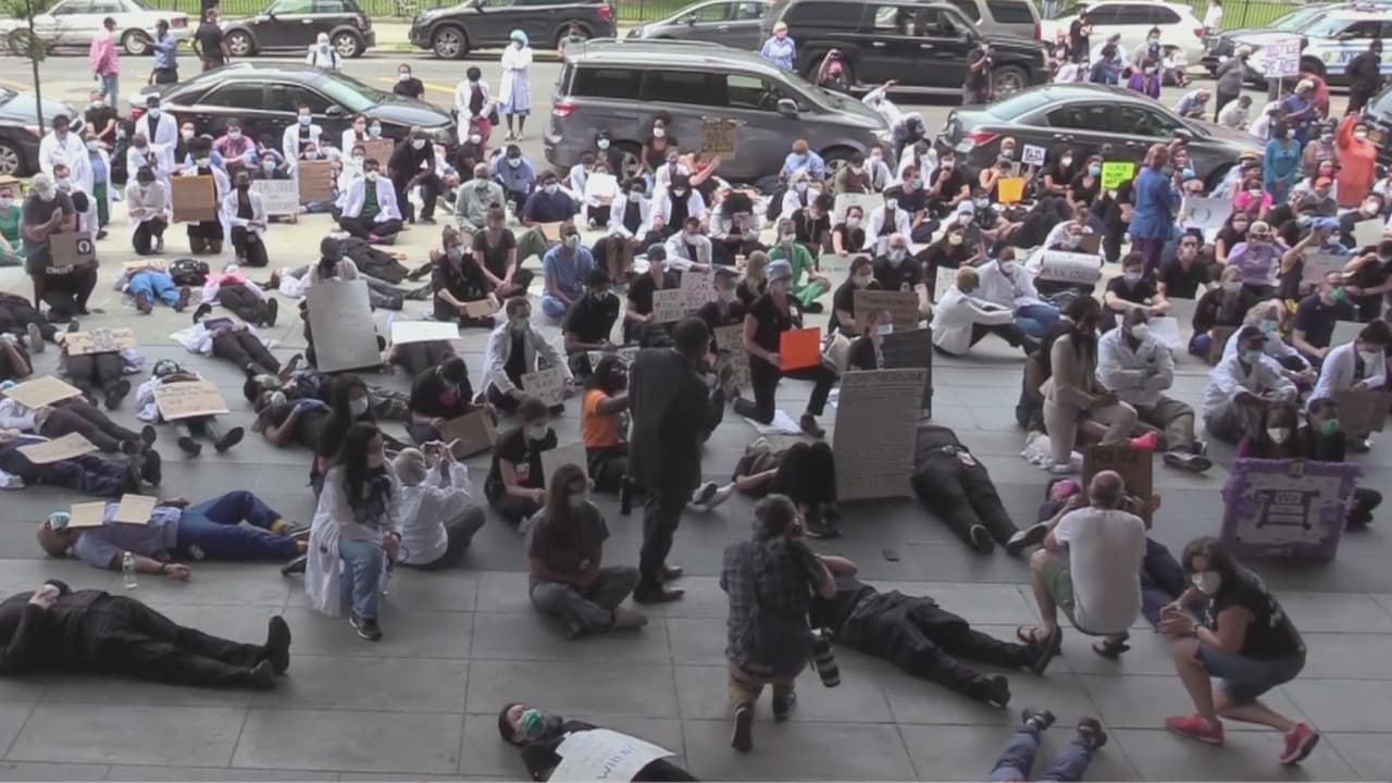 Personal médico de un hospital en Brooklyn hace una pausa para pedir justicia por actos de racismo