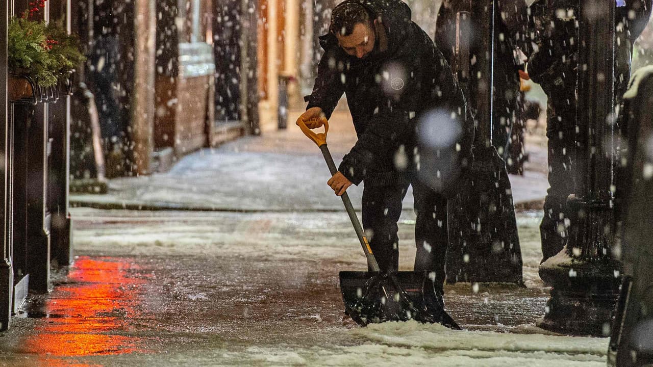 Trabajadores de limpieza y habitantes de la zona tratan de remover la nieve que dejó la tormenta invernal de este jueves en el área. Entretanto, autoridades piden a la comunidad permanecer en casa para dejar que el personal especializado realice las labores de remoción del material blanco de las vías.