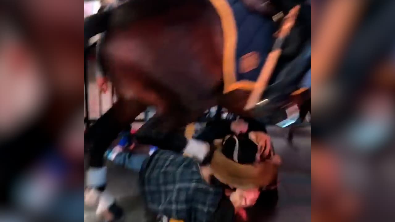 Oficiales de la policía montada de la ciudad de Nueva York intentaron detener una pelea pisoteando a los involucrados con sus caballos.