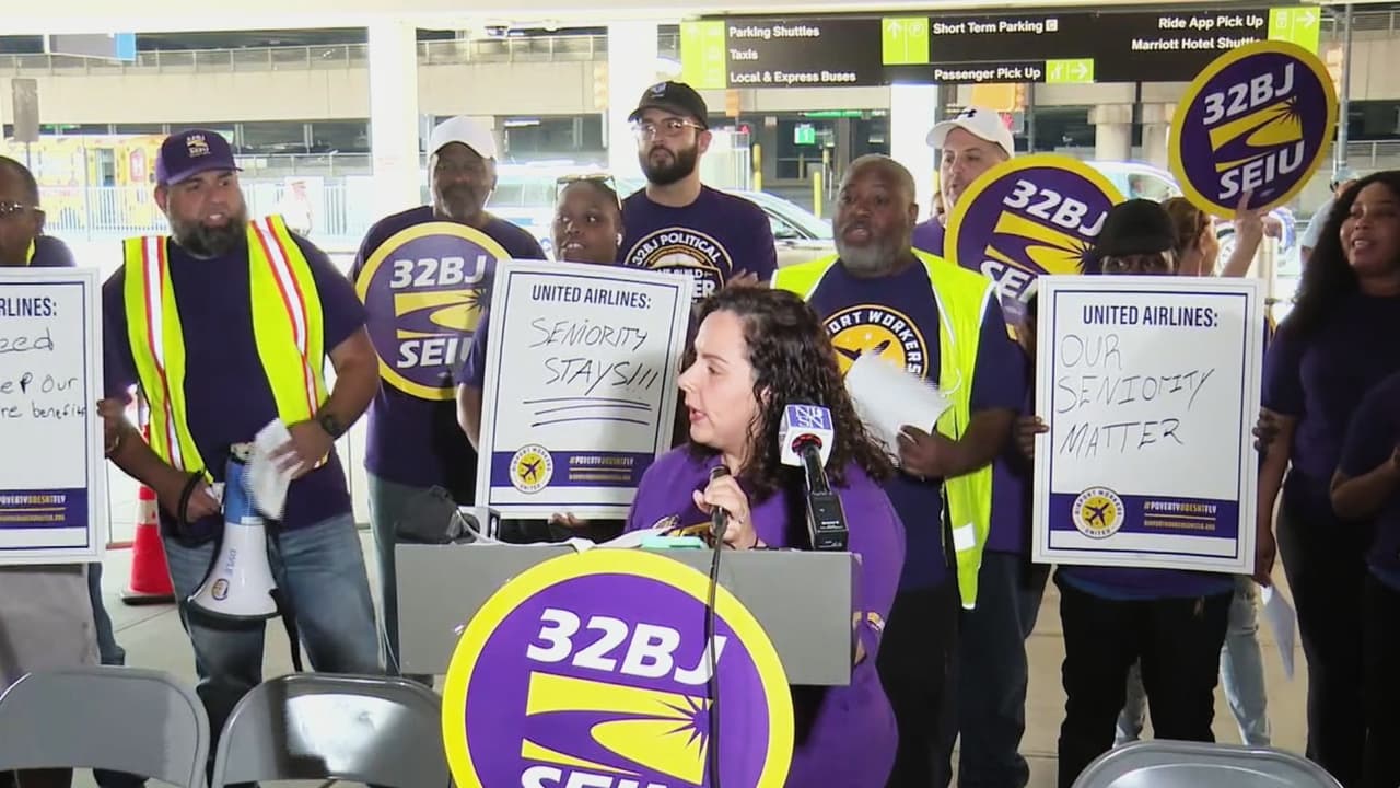 Este jueves, un grupo de trabajadores del sindicato 32BJ SEIU, protestó en el Aeropuerto Internacional Libertad de Newark, de cara al fin de semana largo por el 4 de Julio. Denuncian que estarían a punto de perder sus trabajos o ver reducidas sus horas laborales. “United le dio el contrato a otra compañía que se llama United Ground Express”, señala Ana María Hill, una de las denunciantes.