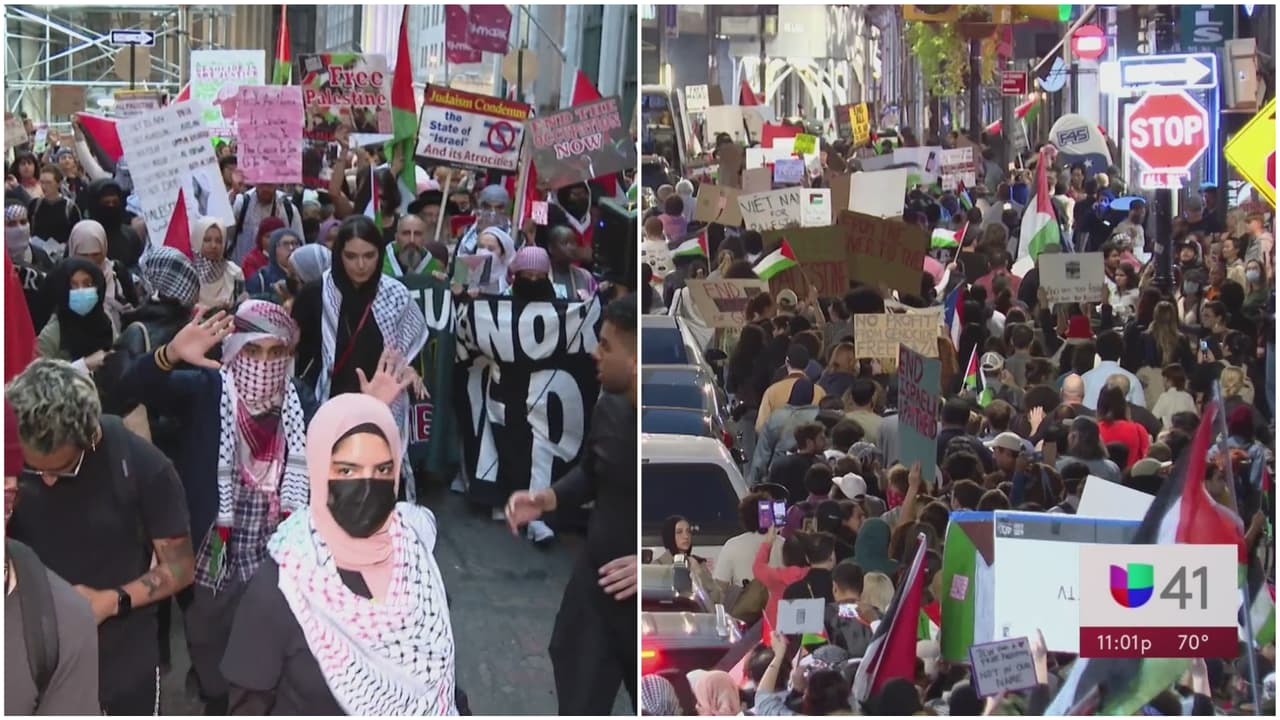 Cientos de personas desfilaron este jueves por las calles del bajo Manhattan para protestar por la respuesta militar de Israel en Gaza al ataque de Hamas. Los manifestantes aseguran que más de 7,000 palestinos han sido aniquilados y culpan a Estados Unidos de financiar el conflicto en el Medio Oriente con ayuda económica hacia Israel.