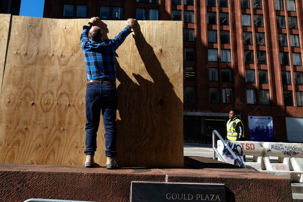Una pared de madera se construye en Gould Plaza frente a la Escuela de Negocios de New York University (NYU). Las autoridades universitarias afirman que están en máxima alerta y buscan cuidar la integridad y seguridad de todos los estudiantes.