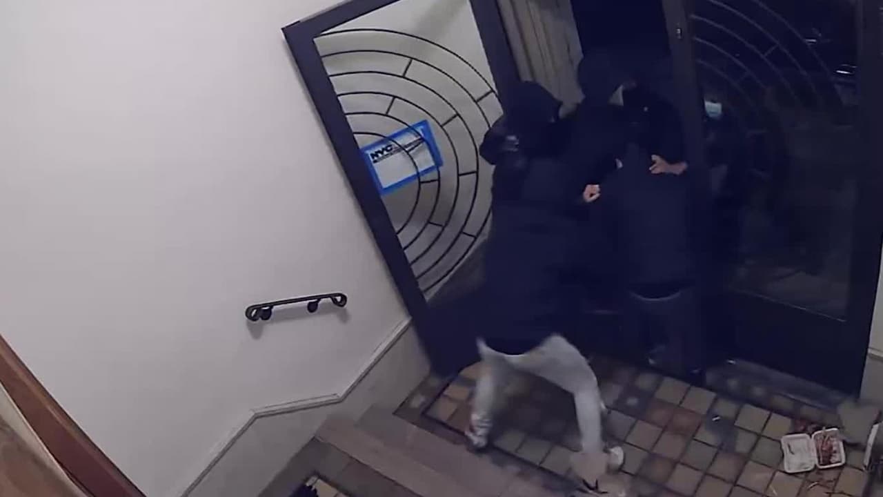 Imágenes de vídeo de vigilancia de un grupo que ataca y roba a un repartidor de comida en un edificio de apartamentos de Inwood en Manhattan el 6 de febrero de 2022, según la policía.