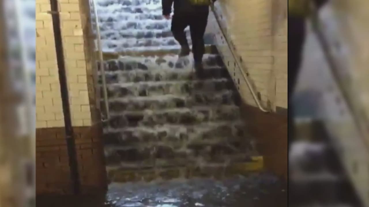 La lluvia inundó las escaleras y la estación de la calle 145 y Broadway, en Manhattan, así como el agua logró filtrarse en el tren F.