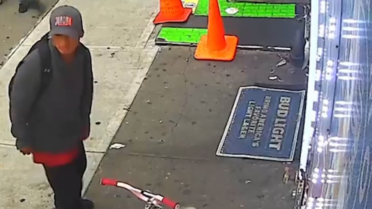 El sospechoso de robarle el teléfono a una niña de 10 años en Queens, y lastimarle la mano, fue captado en video mientras transitaba en una bicicleta rosa y blanca con mariposas.