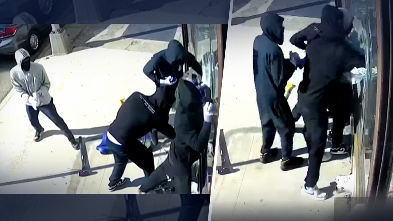 En el video de vigilancia se muestra cómo llevan mazos para golpear la ventana de la joyería Golden Square en Broadway.