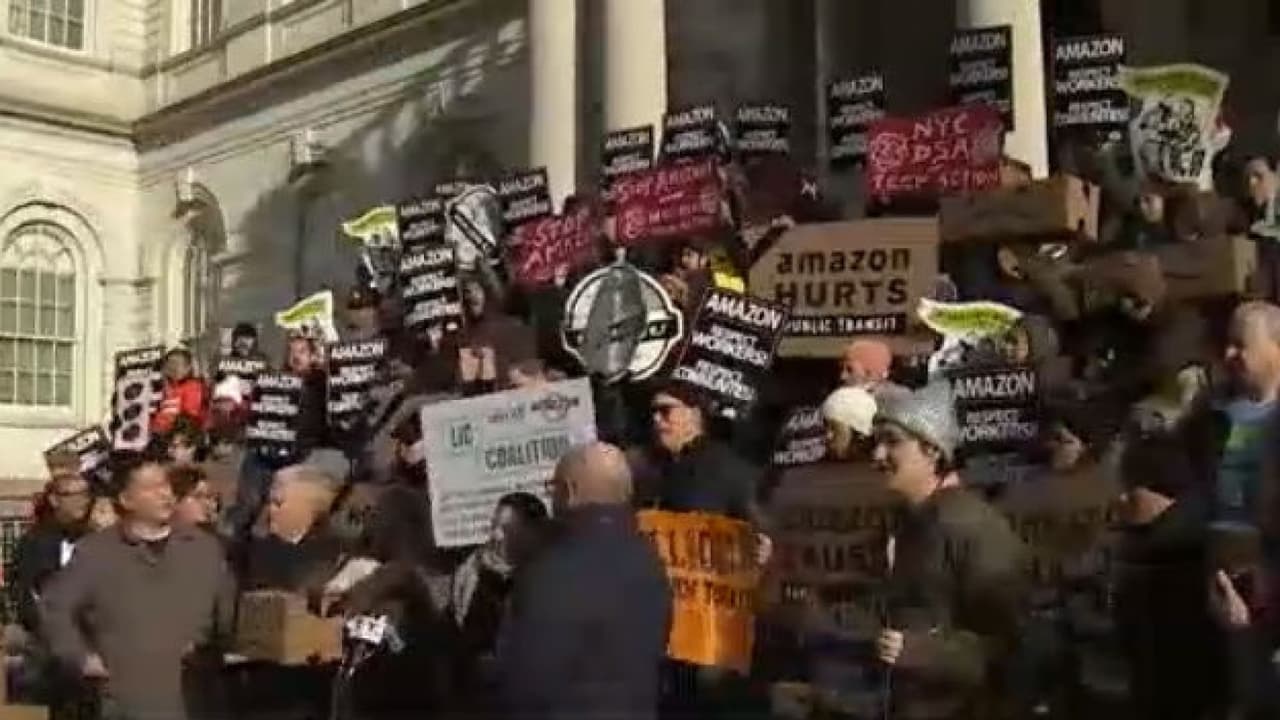 En medio de un proceso de audiencia del Concejo Municipal de Nueva York, decenas de personas se manifestaron en la Alcaldía por la manera en que se hizo el acuerdo con el gigante de las ventas por internet.
