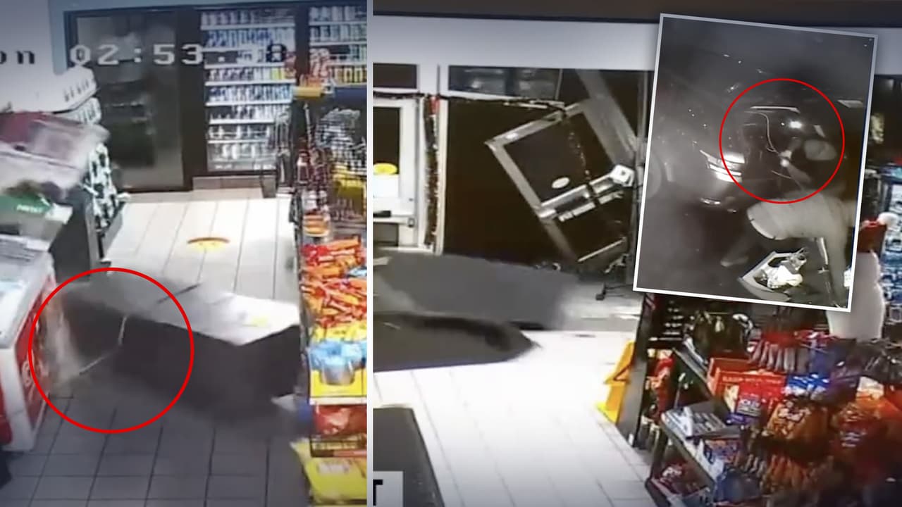 Un video de seguridad captó el momento en que ladrones entran a una tienda en Connecticut y roban cajero automático al estilo de una película de acción. Los sospechosos amarraron el artefacto con un cable.
