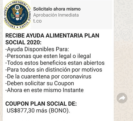 These two messages offer free money or aid if you click on the link. The president of the United States is offering all people in America, including undocumented residents, $877.30 or follow this link to apply for food aid worth between $977.77 and $1,497.77.