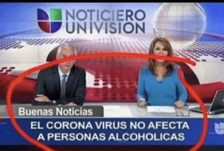 Univision image of Jorge Ramos and Maria Elena Salinas with text below them that says “El corona virus no afecta a personas alcoholicas.”