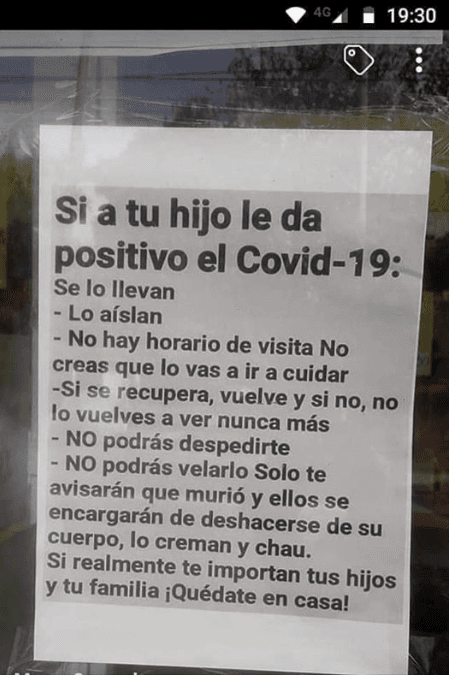 Picture of a sign that claims children who test positive for COVID-19 will be taken away from their parents