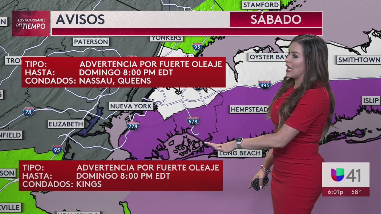 Se ha emitido una advertencia por fuerte oleaje para los condados Nassau, Queens y Kings vigente hasta las 8 de la noche del domingo. También hay alertas por inundaciones aisladas y por corrientes de resaca.