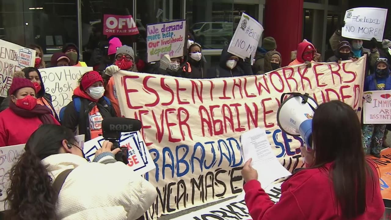Trabajadores excluidos de ayudas del gobierno protestan en Nueva York para exigir beneficios y protección