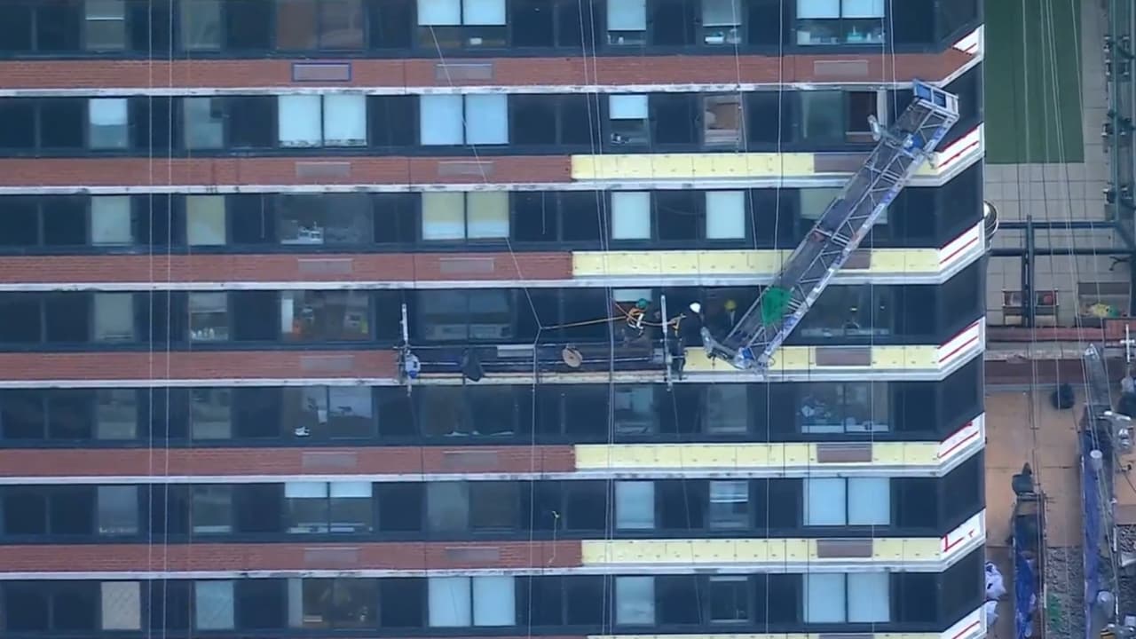 Un peligroso incidente ocurrió en un edificio de 330 East 75th Street, en Manhattan, luego de que dos trabajadores quedaran colgados por la falla de un andamio. El Unicóptero 41 captó el momento.
