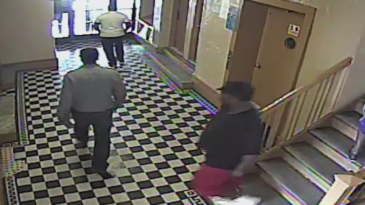 Una cámara de seguridad captó el momento en el que los sospechosos escapan del edificio en el que habrían ingresado, por medio de engaños, a un apartamento para robar y agredir a una anciana y a la mujer que la cuidaba.