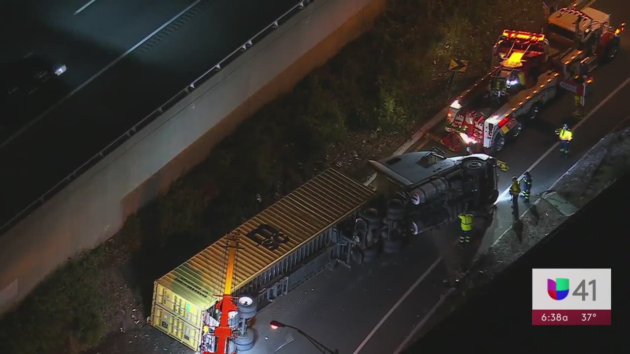 Un camión de 18 ruedas se volcó en el Nueva Jersey Turnpike en Ridgefield Park la madrugada de este jueves.