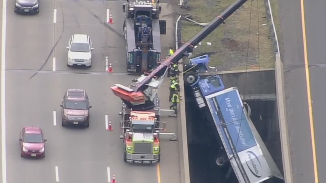 Un camión de carga queda colgando de una autopista tras provocar un accidente en Nueva Jersey