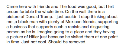 La controversia dio inicio hace unos meses, cuando a través de Yelp! un usuario publicó que había comido en el lugar, pero que se sintió incómodo porque como hombre de raza negra y con varios amigos mexicanos estaba patrocinando un negocio que presumía una foto de una persona tan “racista” y “desagradable” como Trump. “Es como tener una foto de Hitler porque un día los visitó. Deberían quitarla”.