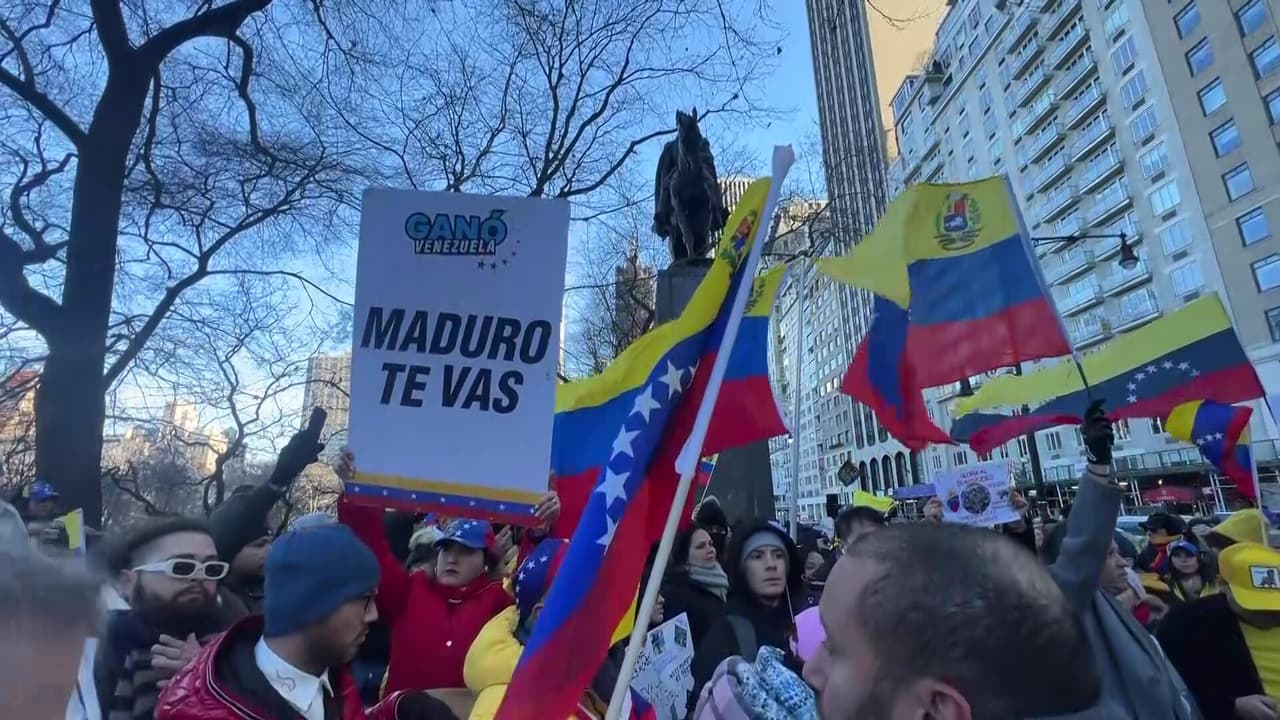 Venezolanos en Nueva York protestan contra juramentación de Maduro frente a monumento de Simón Bolívar
