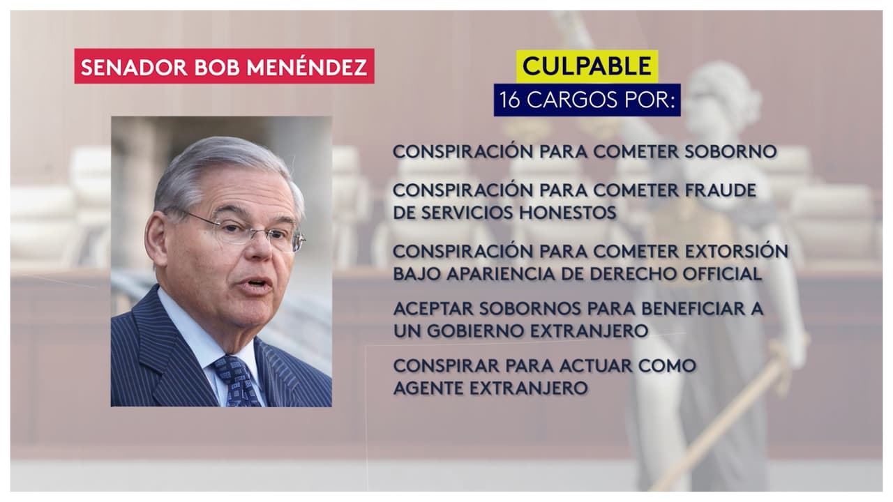 El senador Bob Menéndez fue declarado culpable de todos los cargos que enfrentaba, incluyendo de aceptar sobornos en oro y dinero en efectivo de tres empresarios de Nueva Jersey, y de actuar como agente del gobierno egipcio.