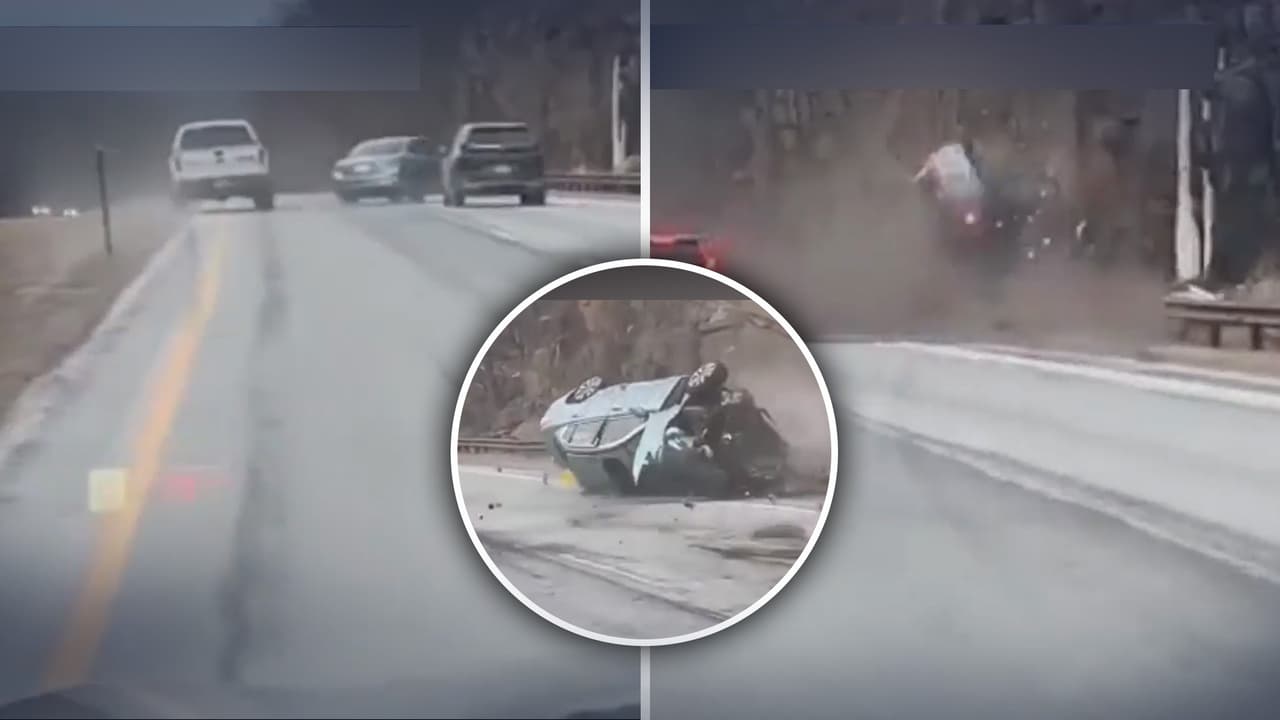 Un video captó el momento en que el conductor de un automóvil pierde el control entre dos vehículos que intentaba rebasar, provocando su volcadura en una carretera en Nueva Jersey.