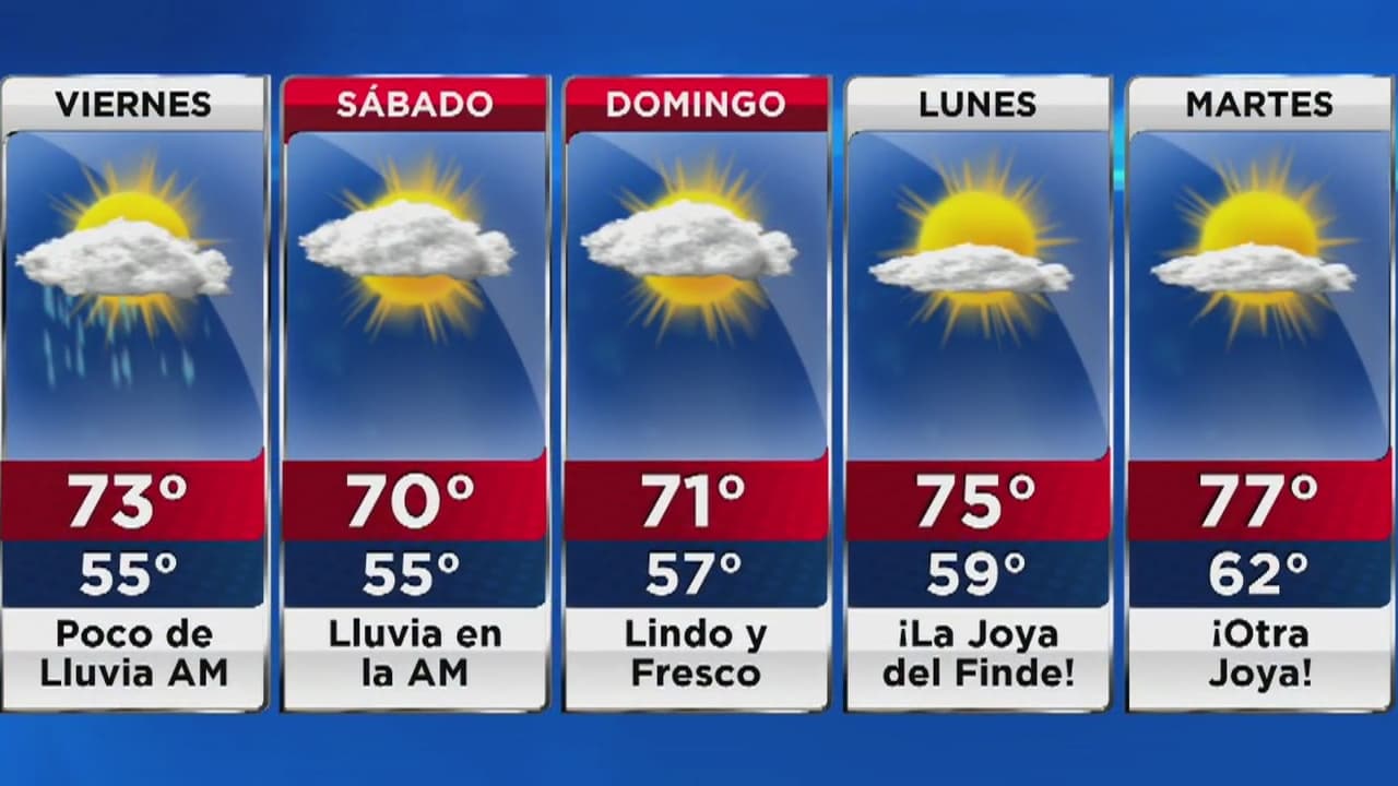 La mañana será de calor y cielo despejado, pero después del medio día las condiciones podrían cambiar. La temperatura máxima llegará a los 73 grados. El fin de semana podría ser un poco nublado.