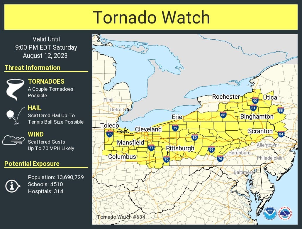 El Servicio Nacional de Meteorología (NWS, por sus siglas en inglés) emitió una alerta de vigilancia de tornado para partes de los estados de Nueva York, Pensilvania, Ohio y West Virginia hasta las 9 de la noche de este sábado.