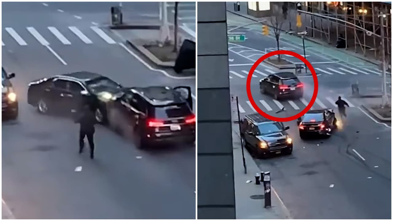 Un video muestra el momento en el que un conductor roba de forma violenta un auto en Midtown Manhattan, arrastrando a vehículo y embistiendo a otro. Un oficial de policía estaba en la escena y resultó herido.