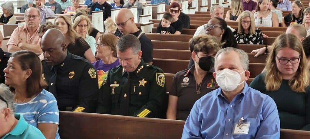 John Mina participó en la ceremonia del “toque de las campanas” en honor a los 49 víctimas en la Iglesia Metodista Unida del centro de Orlando. El próximo jefe de OPD, Eric Smith, también se unió a los líderes comunitarios y las familias de los fallecidos en honor y reflexión