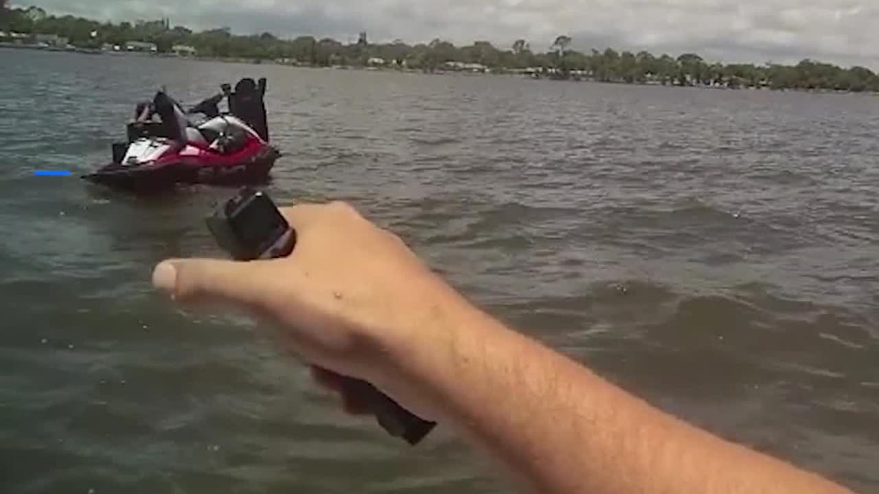 En el video de la cámara corporal se ve cuando localizan al hombre flotando sobre la moto de agua, la cual nunca pudo poner a funcionar, y le ordenan levantar las manos y nadar hacia el bote donde estaban los agentes.