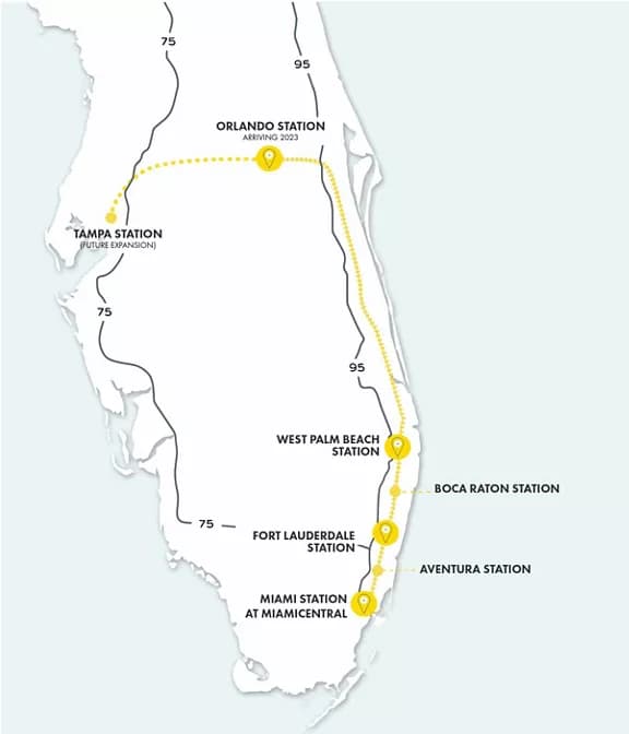 El viaje entre Orlando y West Palm Beach es de aproximadamente dos horas, y tres horas y media entre Orlando y Miami a 115 millas por hora (185km/h).