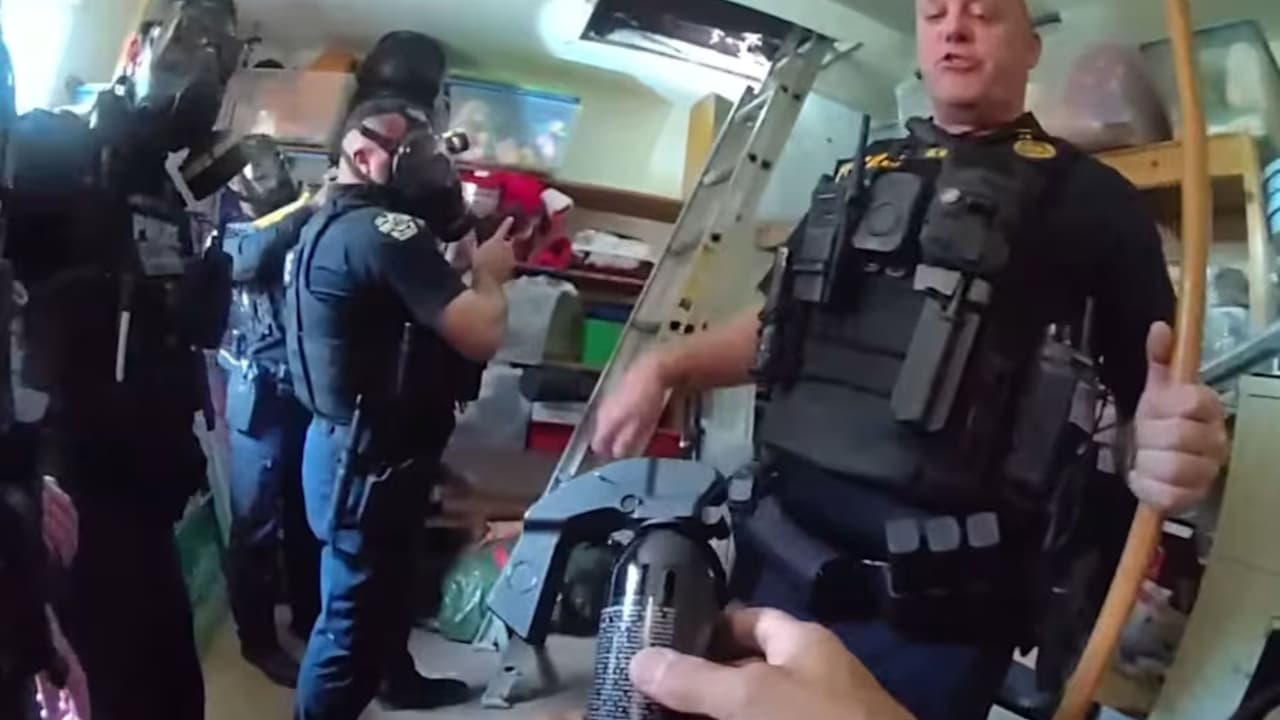 Poco después de aplicar los irritantes en el área, un pie rompió el techo del cuarto de almacenamiento, dejando un gran agujero. Los oficiales, que captaron el momento a través de sus cámaras corporales, le ordenaron al sospechoso que mostrara las manos y descendiera.