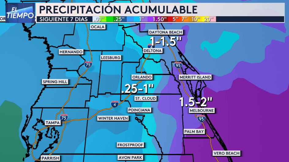 El condado Volusia podría recibir hasta 1,5 pulgadas de acumulación de lluvia, mientras que el condado Brevard tendría hasta 2 pulgadas de precipitación acumulable. Por su parte, el área de Oralndo sólo alcanzaría hasta 1 pulgada.