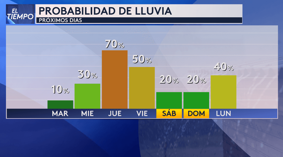 Sin embargo, la probabilidad de aguaceros aumenta desde la tarde de este miércoles, hasta el viernes.