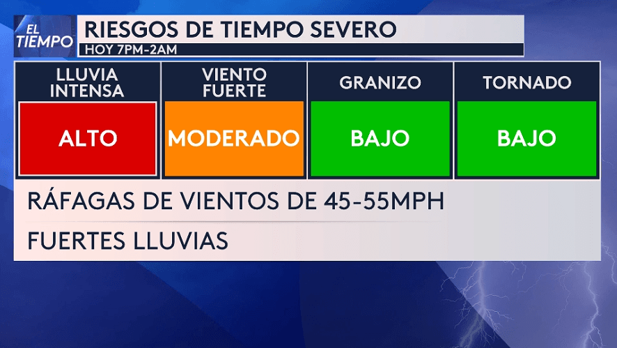 A pesar de que las tormentas severas serán aisladas, hay baja probabilidades de tornados o granizo, pero tendremos ráfagas de viento de 45 a 55 mph.