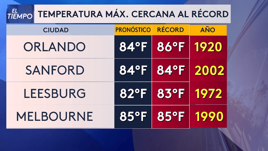 Además, este miércoles estamos muy cerca de alcanzar el récord de temperatura máxima en varias zonas de Florida Central, incluyendo Orlando: