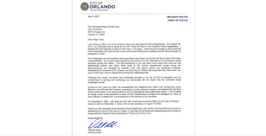 El jefe del Departamento de Policía de Orlando, Orlando Rolón anunció su retiro en una carta dirigida al alcalde de Orlando, Buddy Dyer.
