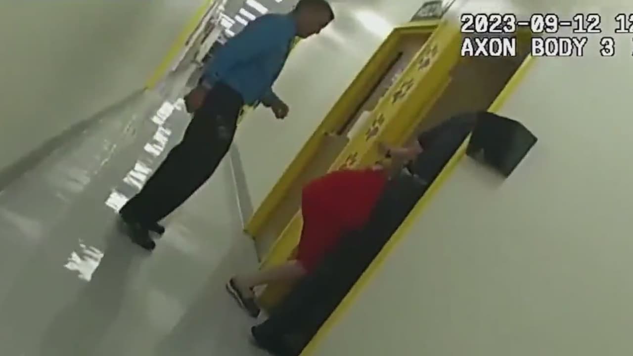 La cámara corporal del oficial muestra el momento en que tira al estudiante al suelo y luego lo esposa, mientras que incluía insultos en las instrucciones que le daba al menor.
