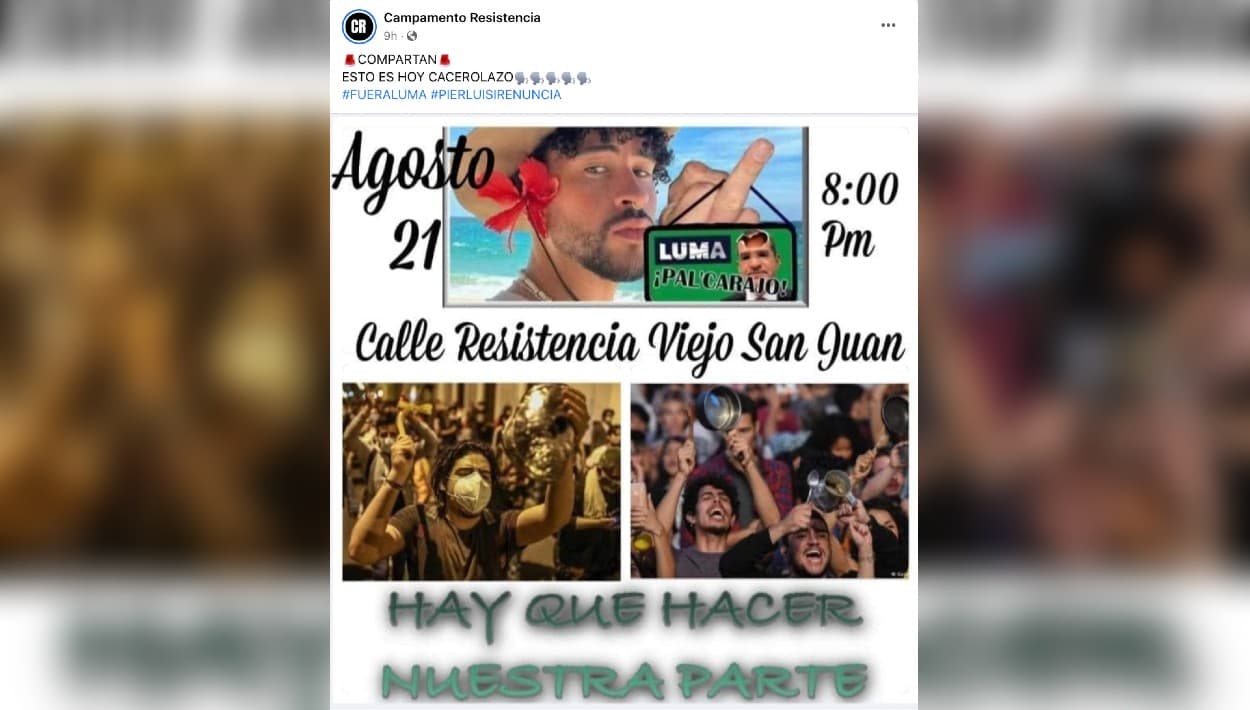 Este domingo 21 de agosto comenzaron los cacerolazos, a las 8:00 de la noche, frente a la residencia del gobernador Pedro Pierluisi en el Viejo San Juan. Allí se exigió su renuncia al igual que la salida del consorcio LUMA Energy de Puerto Rico. El Movimiento Resistencia, que en su convocatoria utilizó una imagen de Bad Bunny, en alusión al mensaje que ofreció en sus conciertos contra el gobernador y LUMA, consignó que las manifestaciones seguirán hasta conseguir el cambio.